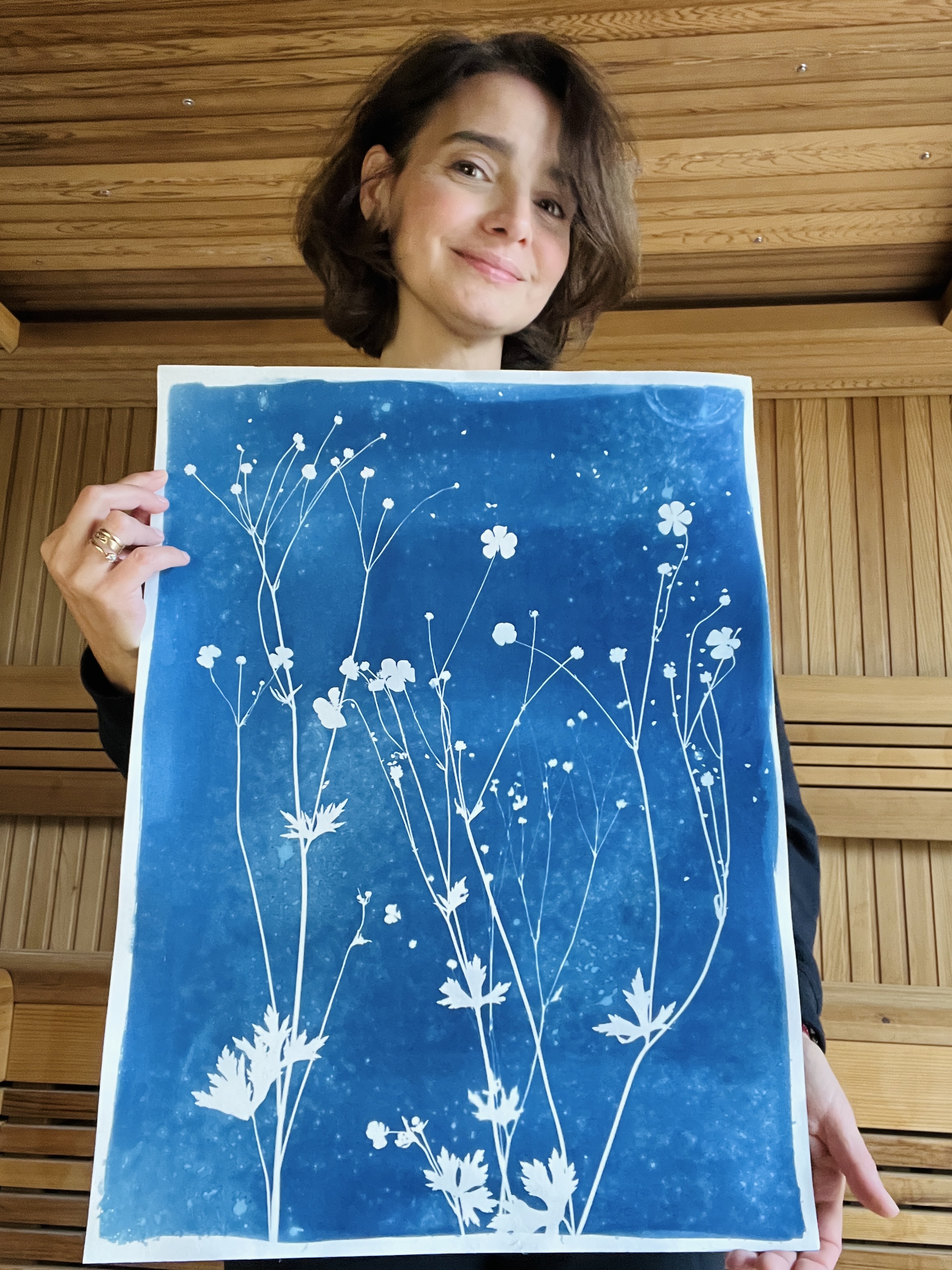Meine Leidenschaft für Cyanotypie entwickelte sich im Laufe meiner künstlerischen Weiterbildungen. Dieses Verfahren fasziniert mich, weil es auf einer tiefen Verbindung mit den Elementen der Natur basiert. Sonnenlicht und Wasser sind zentrale Bestandteile meiner Werke. Besonders schätze ich die Technik der Doppelbelichtung, bei der zwei Bilder zu einer Erzählung verschmelzen und so eine visuelle Poesie entsteht, die den Betrachter in eine neue, oft verträumte Welt entführt.