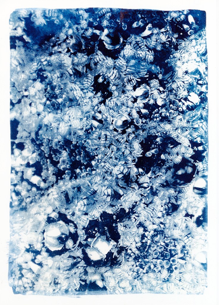 La imagen revela una callosidad de ballena franca austral: formaciones rugosas y únicas que surcan su cabeza como mapas irrepetibles. Como las huellas dactilares en los humanos, estas marcas permiten reconocer a cada individuo y seguir su historia a lo largo del tiempo y el océano. Sobre su superficie se instalan pequeños crustáceos llamados ciámidos, que no solo acentúan su relieve sino que hacen de cada callosidad un paisaje habitado. En este azul profundo, lo que a simple vista parece una textura abstracta es, en realidad, una huella de identidad: memoria viva inscrita en la piel del mar.