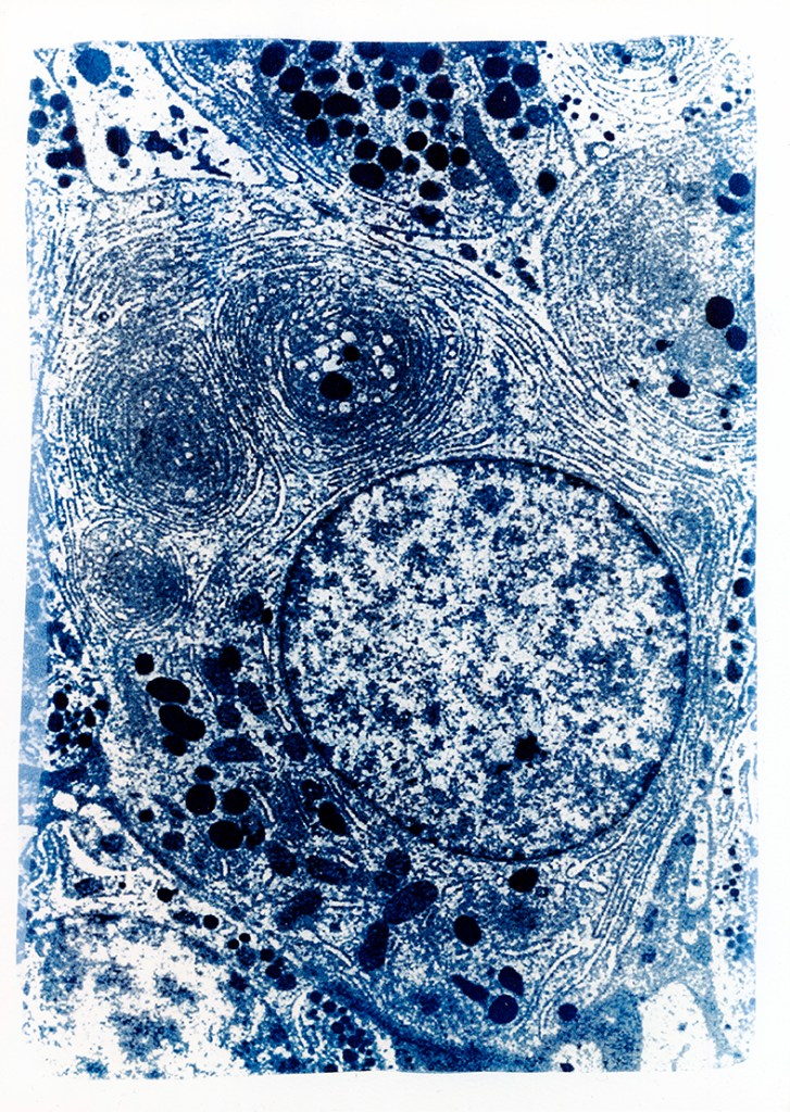 La imagen parte de una micrografía electrónica de transmisión que muestra una célula lactotropa, responsable de producir prolactina, la hormona que regula la lactancia. Esta diminuta estructura, casi invisible al ojo humano, sostiene uno de los vínculos más profundos entre madre e hijo: la capacidad de nutrir. Presentes tanto en humanos como en ballenas, estas células nos recuerdan que ser mamíferos es, ante todo, compartir el gesto de alimentar.