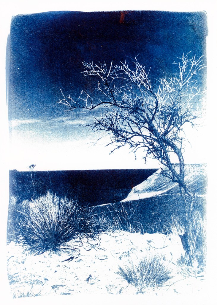 El paisaje muestra la estepa patagónica desde Punta del Marqués, en Rada Tilly, un mirador natural donde el viento sopla con fuerza y el horizonte se funde con el mar. Durante la temporada de cría, es posible avistar ballenas francas australes desde estas alturas, moviéndose con lentitud entre las olas. En este azul mineral, la tierra árida y el océano abierto se encuentran como dos memorias que se tocan: una fija y otra en movimiento.