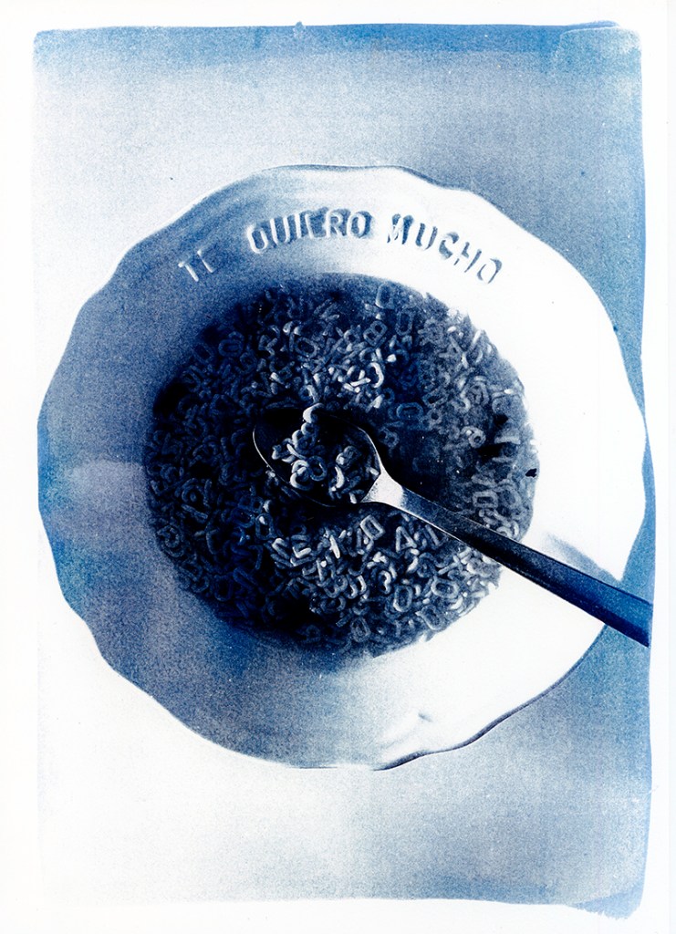 Sobre el borde de un plato de sopa, se lee un mensaje sencillo y esencial: te quiero mucho. Las letras, flotando como pequeñas islas de sentido, evocan los primeros juegos con el lenguaje, cuando aprender a nombrar era también una forma de estar cerca.